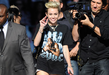 Miley Cyrus demonstrou seu amor pelo lendário rapper Tupac Shakur, falecido em 1996, usando uma camiseta com o rosto dele para ir ao El Capitan Theatre onde foi entrevistada por Jimmy Kimmel, nesta terça-feira (25).
